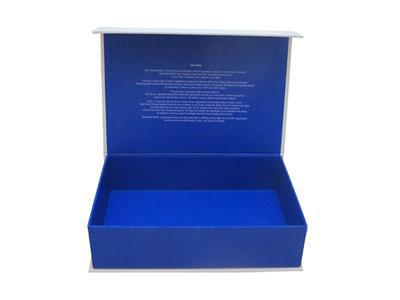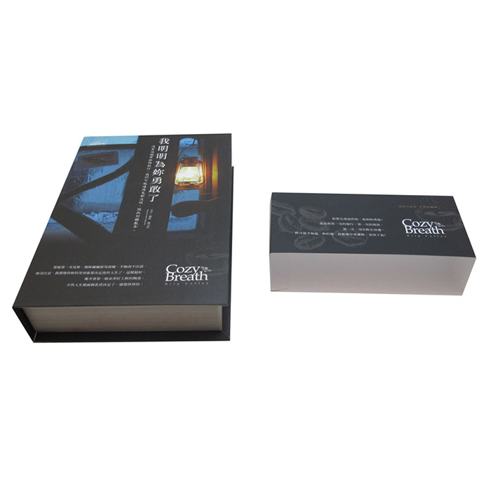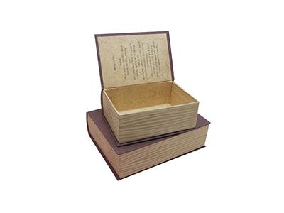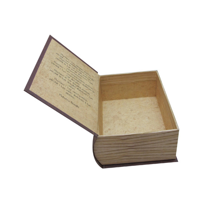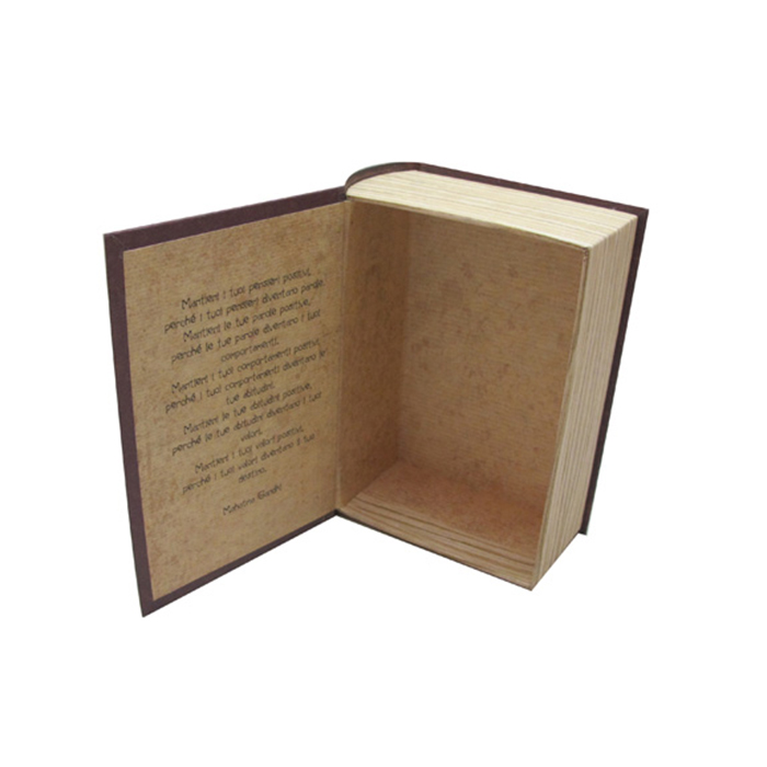 تتكون العلب الكرتونية على شكل كتاب من ثلاث طبقات من الورق (ورق كرافت أبيض 160جم + ورق مقوى رمادي دوبلكس 150جم + ورق كرافت أبيض 160جم). تتم طباعة وتجهيز كلاً من الجزء الداخلي والخارجي للعلبة. يمكن إضافة ملحقات مخصصة للعلبة لتثبيت أو فصل المنتجات الخاصة بك. إن العلب الكرتونية على شكل كتاب ذو جودة عالية وهيكل قوي ومناسب لتغليف الهدايا.