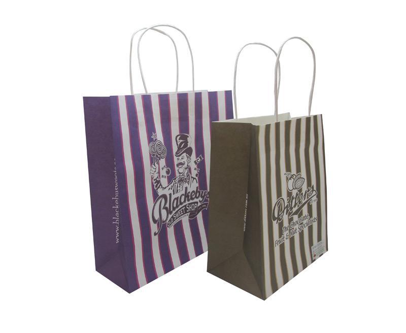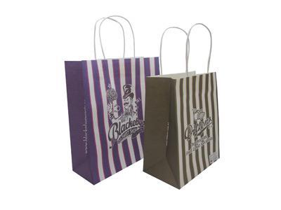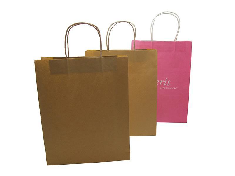 - إن مقابض صلبة والمقابض الورقية منتشرة بصمغ من أجل تعزيز الثبات. يتم تصنيع مجموعات صغيرة من الأكياس الورقية المخصصة يدوياً ويتم لصق دفعات كبيرة بواسطة الآلة.